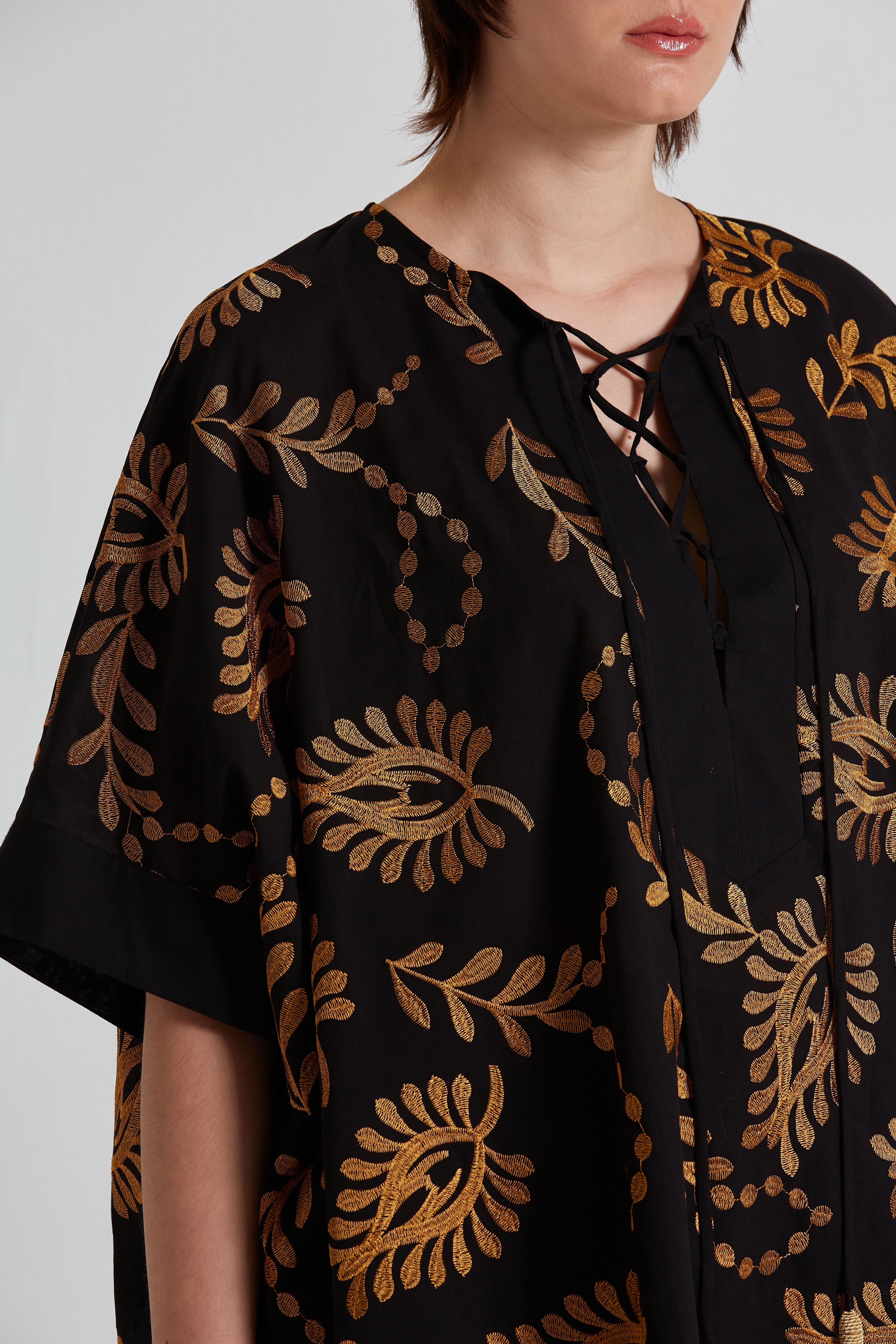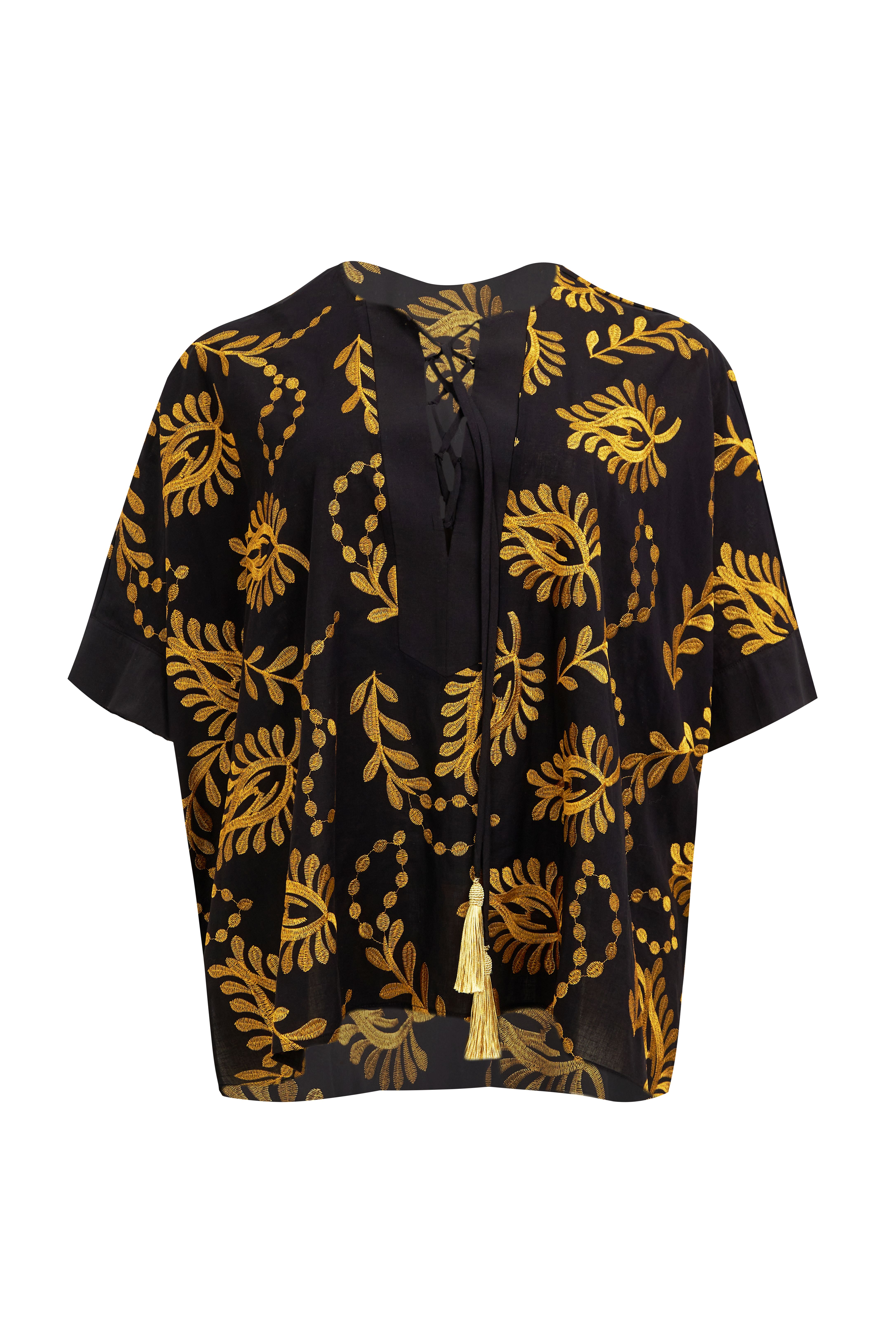 Блуза легкая черного цвета с золотой вышивкой.