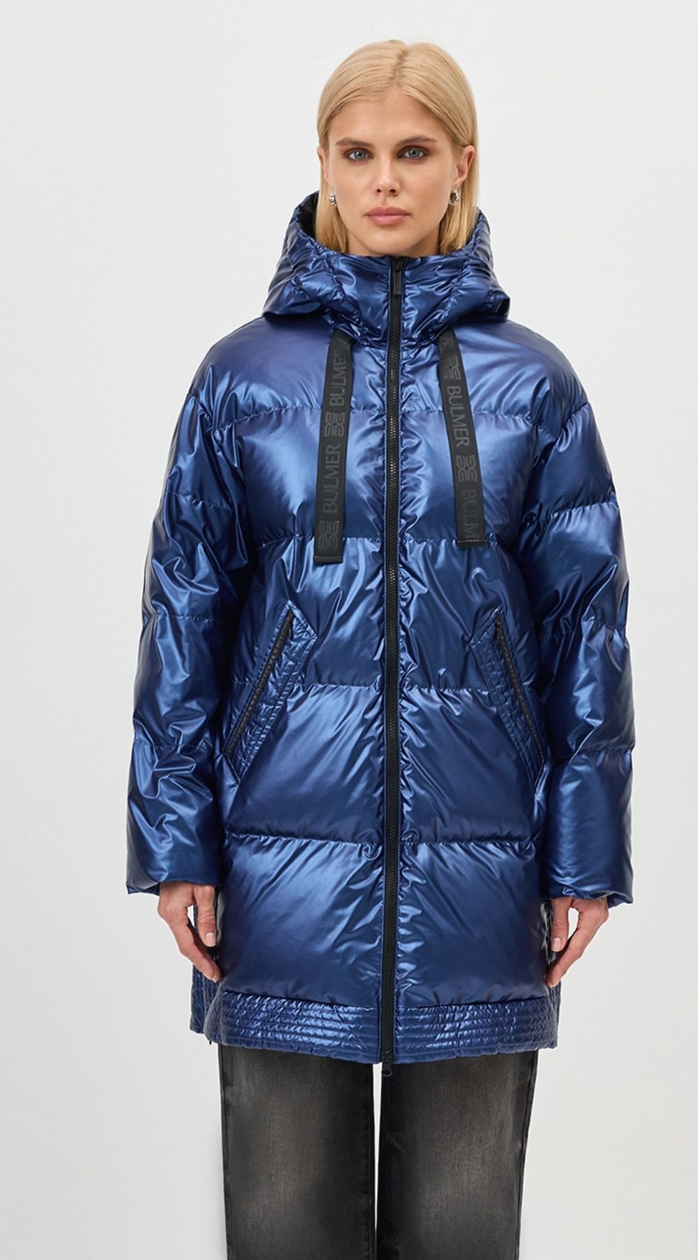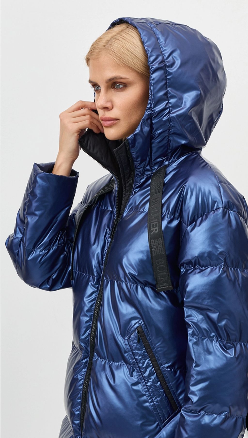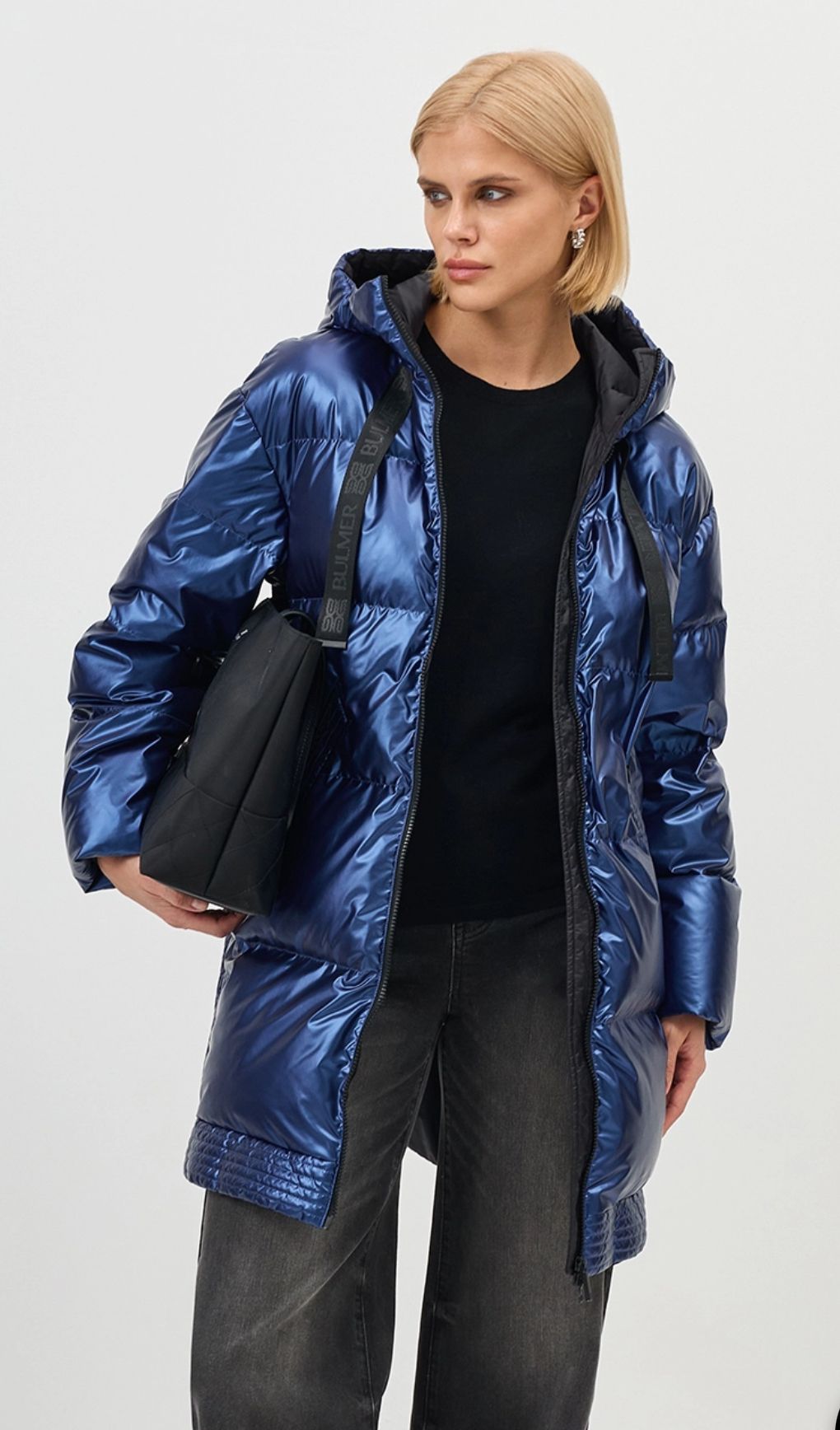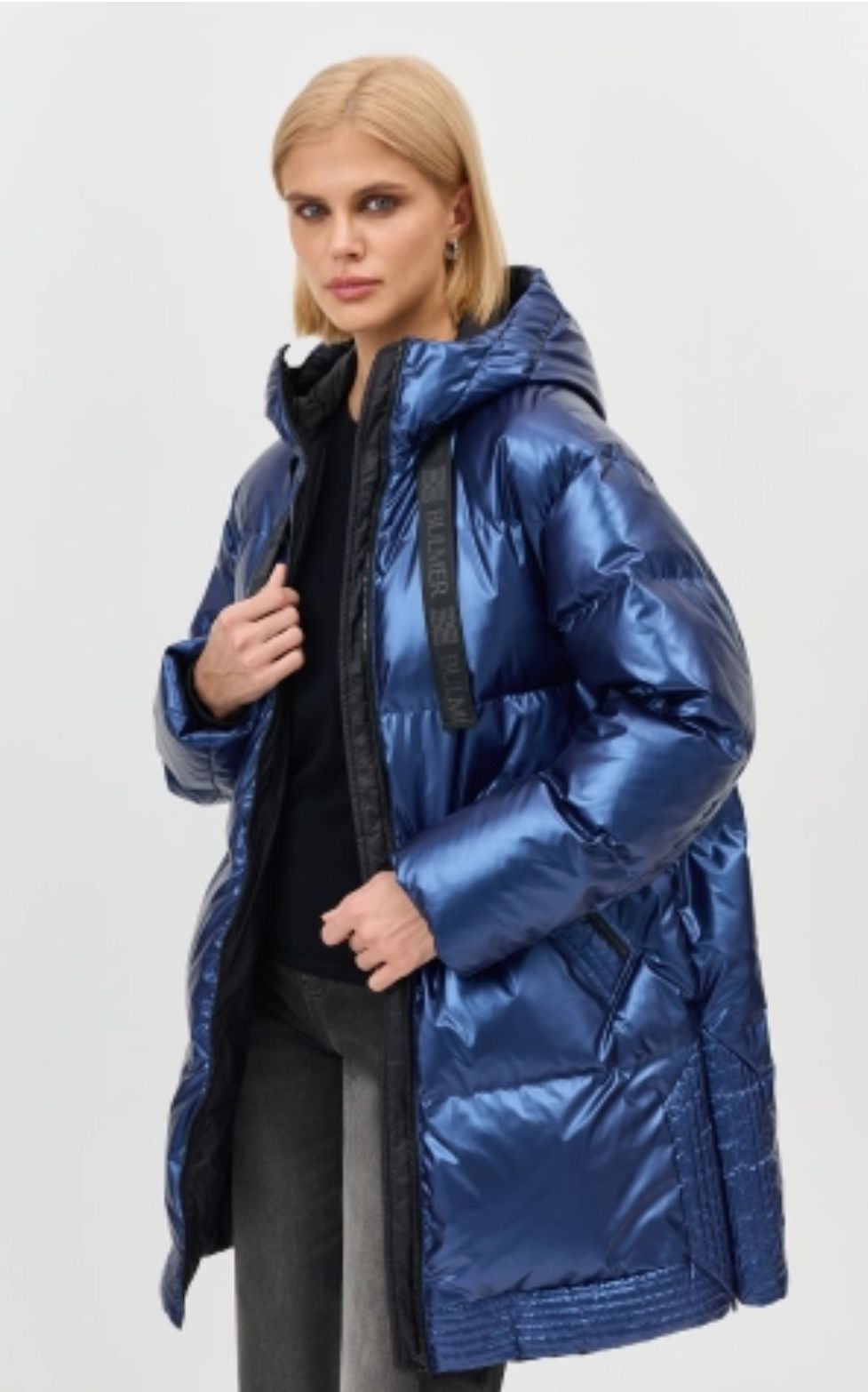 Укороченный синий-металлик пуховик