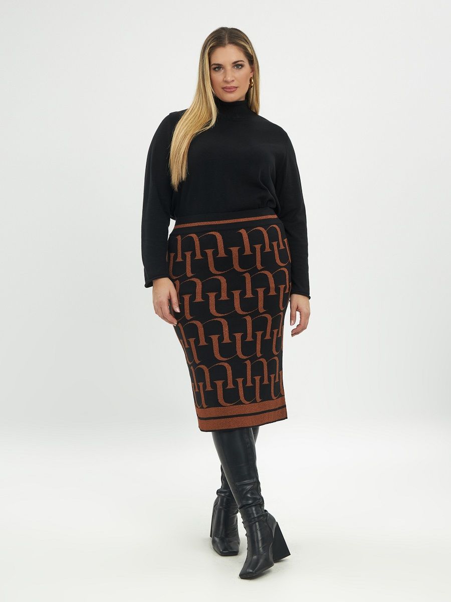 Эффектная юбка-карандаш из трикотажного полотна с буквенным узором - хит сезона осень-зима 2024/25. Металлизированный узор самодостаточен, поэтому не следует сочетать с другими узорами. Стоит отдавать предпочтение однотонным вещам.